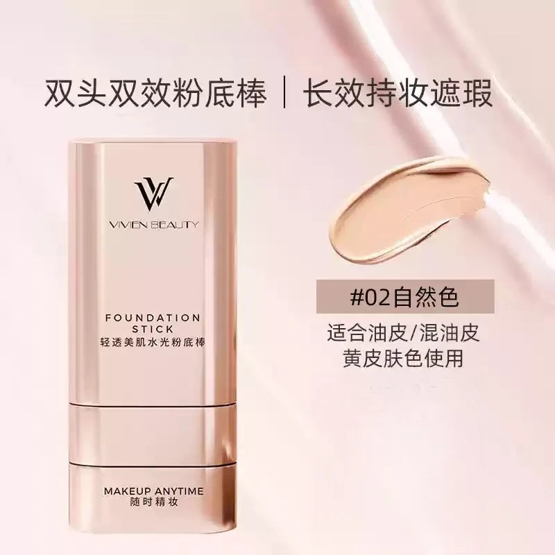 Get flawless, radiant skin with the VV Double-Head Foundation Stick. This versatile stick features a light, transparent concealer and a full-coverage foundation cream. Waterproof and long-lasting, it brightens your skin tone while hiding blemishes and imperfections. Perfect for contouring, touch-ups, or everyday makeup, its smooth, blendable formula ensures a natural, fresh finish that lasts all day, keeping your complexion flawless and radiant.